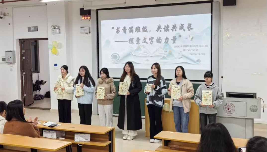 为营造浓厚的班级阅读氛围,激发学生阅读兴趣与思辨能力。文学院2025级汉本四班及五班于2025年11月18日在文科综合楼的915教室举办读书分享会。