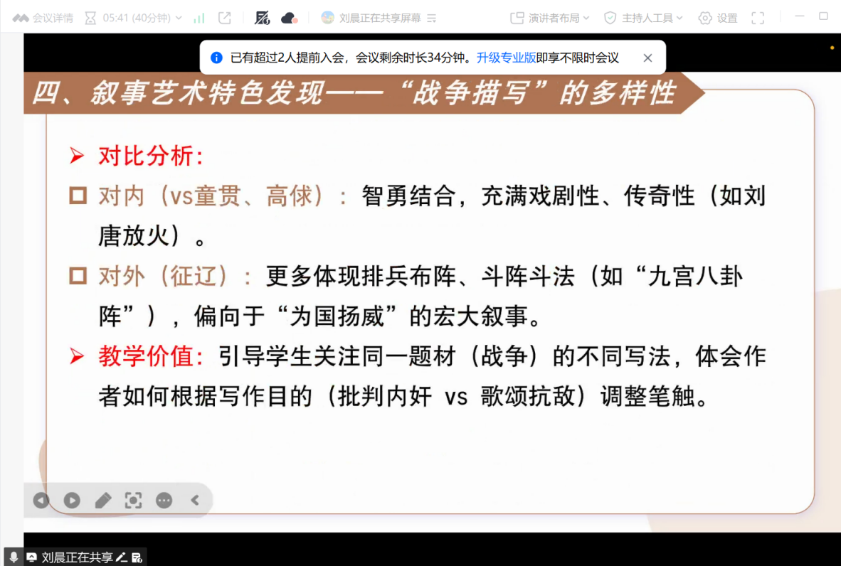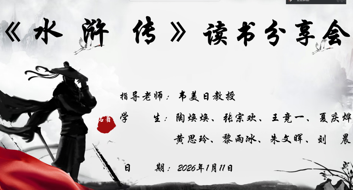 2026年1月11日晚,文学院2024级学科教学(语文)专业韦美日教授导师小组在腾讯会议平台召开《水浒传》读书分享会。会议以“从文本到课堂:《水浒传》整本书阅读与教学”为主题,小组成员围绕文本内容深入探讨。