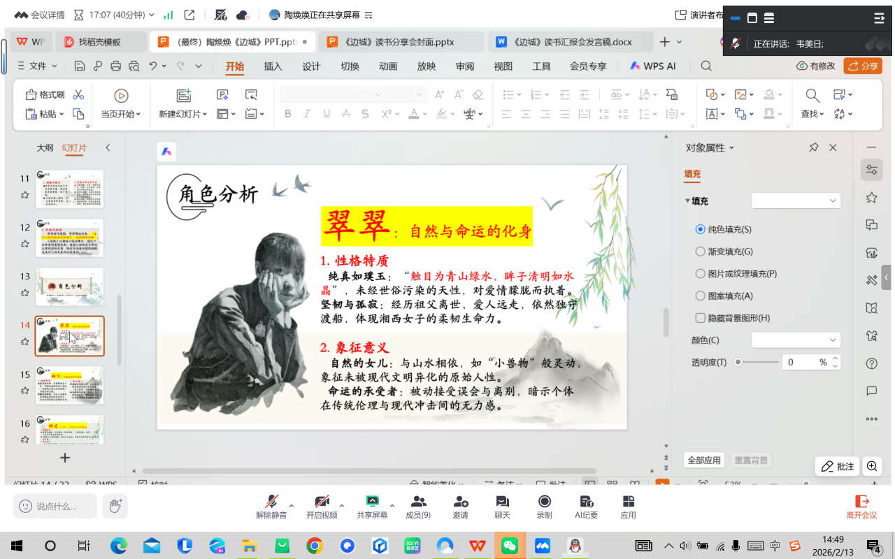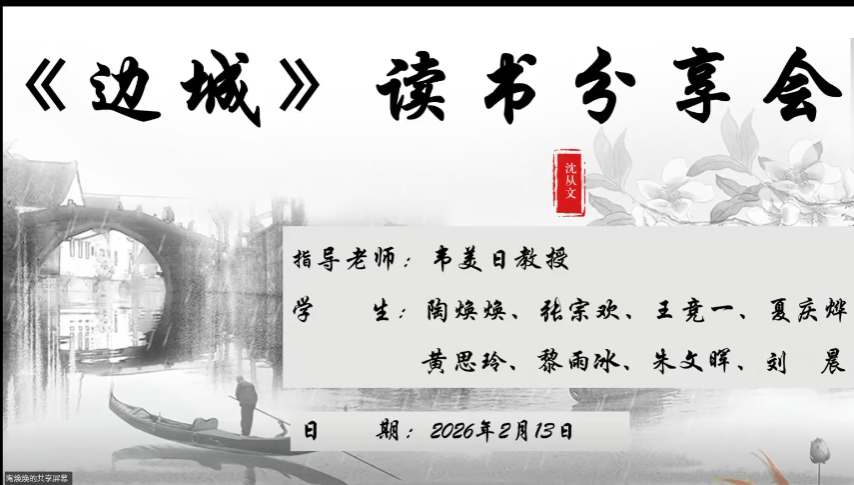 2026年2月13日下午,文学院2024级学科教学(语文)专业韦美日教授导师小组在腾讯会议平台成功召开《边城》读书分享会。本次会议以“诗意经典·课堂共生——《边城》阅读教学探索”为主题,小组成员围绕文本内容展开深入探讨。