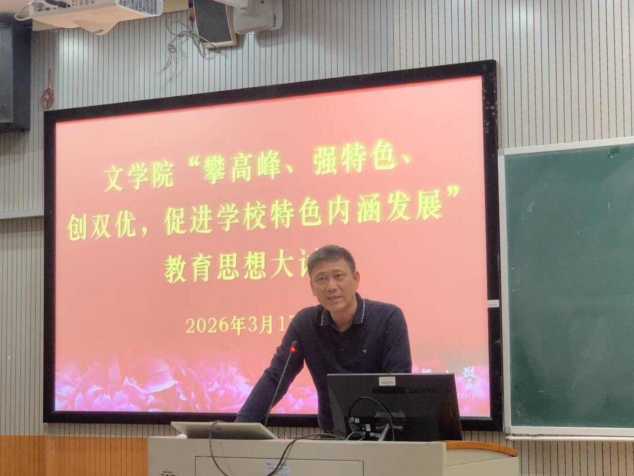 为深入传达落实学校“攀高峰、强特色、创双优,促进学校特色内涵发展”教育思想大讨论工作部署,统一思想、凝聚共识,谋划学院高质量发展路径,3月17日下午,文学院在明秀校区文星楼 414 教室召开教育思想大讨论部署会议。会议由文学院党委书记石勇主持,全院教职工参加会议。