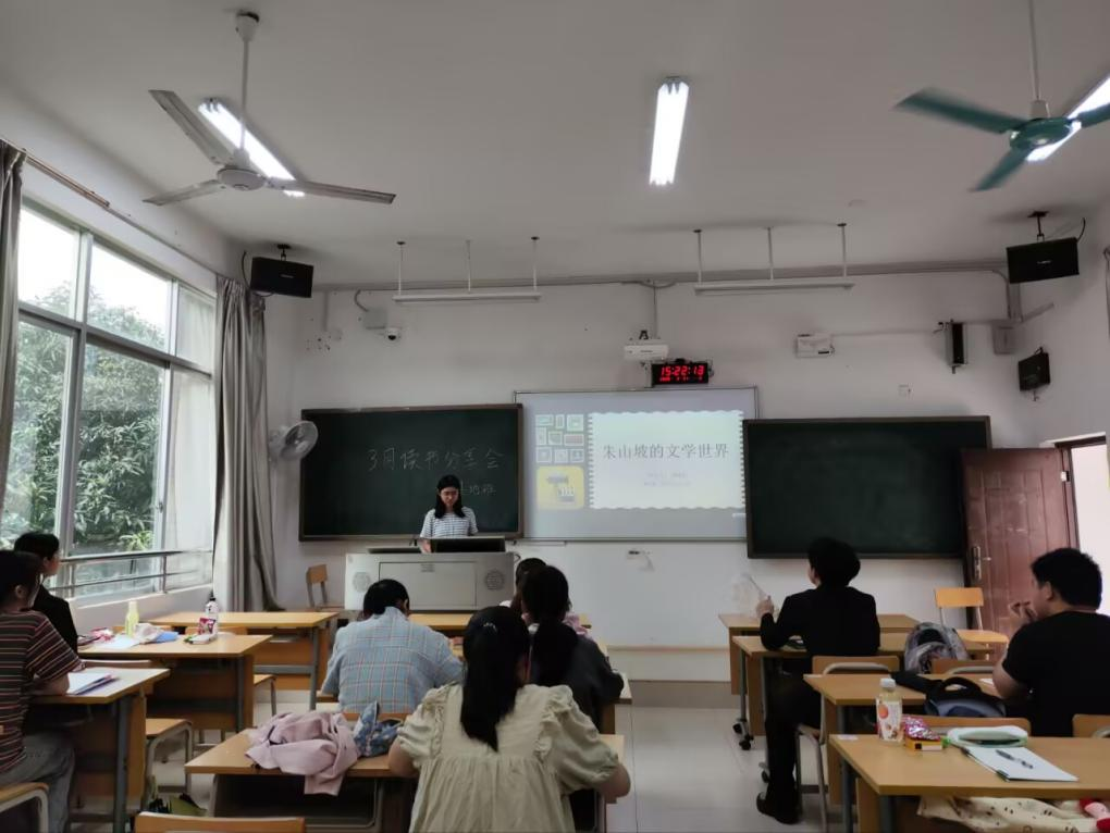 本次分享会由孔海岩同学主持,五位同学从多元视角解读朱山坡作品:黄桂沂同学聚焦小说地理空间,剖析作家以故乡记忆构建米庄、蛋镇、高州等南方小镇的精神原乡图谱;许悦期同学解读《风暴预警期》的散点叙事结构,阐释其独特的叙事艺术;张宁同学关注朱山坡的“读者意识”,引用“作者写下了故事的一半,而读者用自己的人生体验,写下了另一半”的观点引发大家的深思;王烁涵同学细致梳理《萨特勒荒原》作品中贯穿的“逃逸”主题;周易同学则以《风暴预警期》为切入点,深挖南方地域文化内涵。