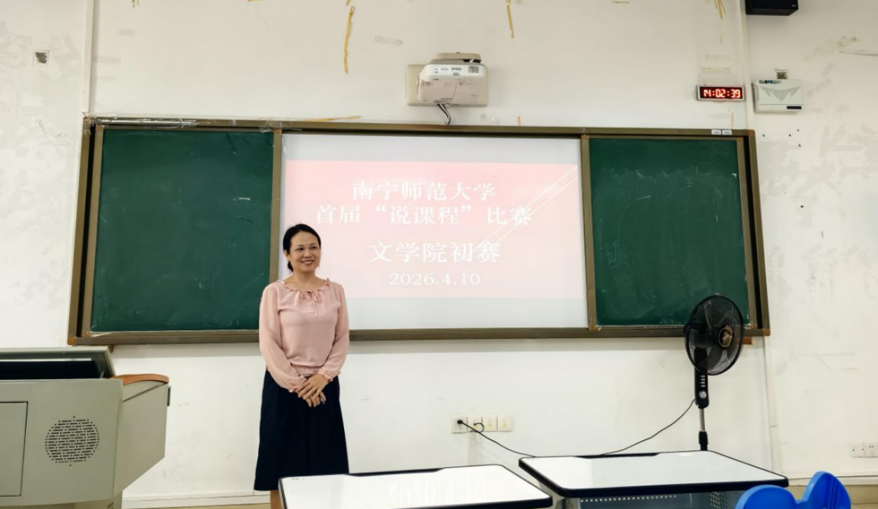 此次初赛不仅是学院教师教学能力的一次综合比拼,更是学院对标“课程建设质量标准”开展的一次全面自查与提升。下一步,文学院将把为深入推进学校“攀高峰、强特色、创双优”教育思想大讨论,全面落实《南宁师范大学课程建设质量标准(试行)》,深化课程内涵建设,4月10日下午,文学院在五合校区文综313教室举办2026年首届说课程比赛院内初赛。