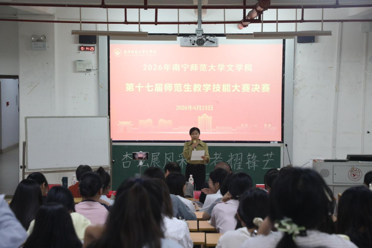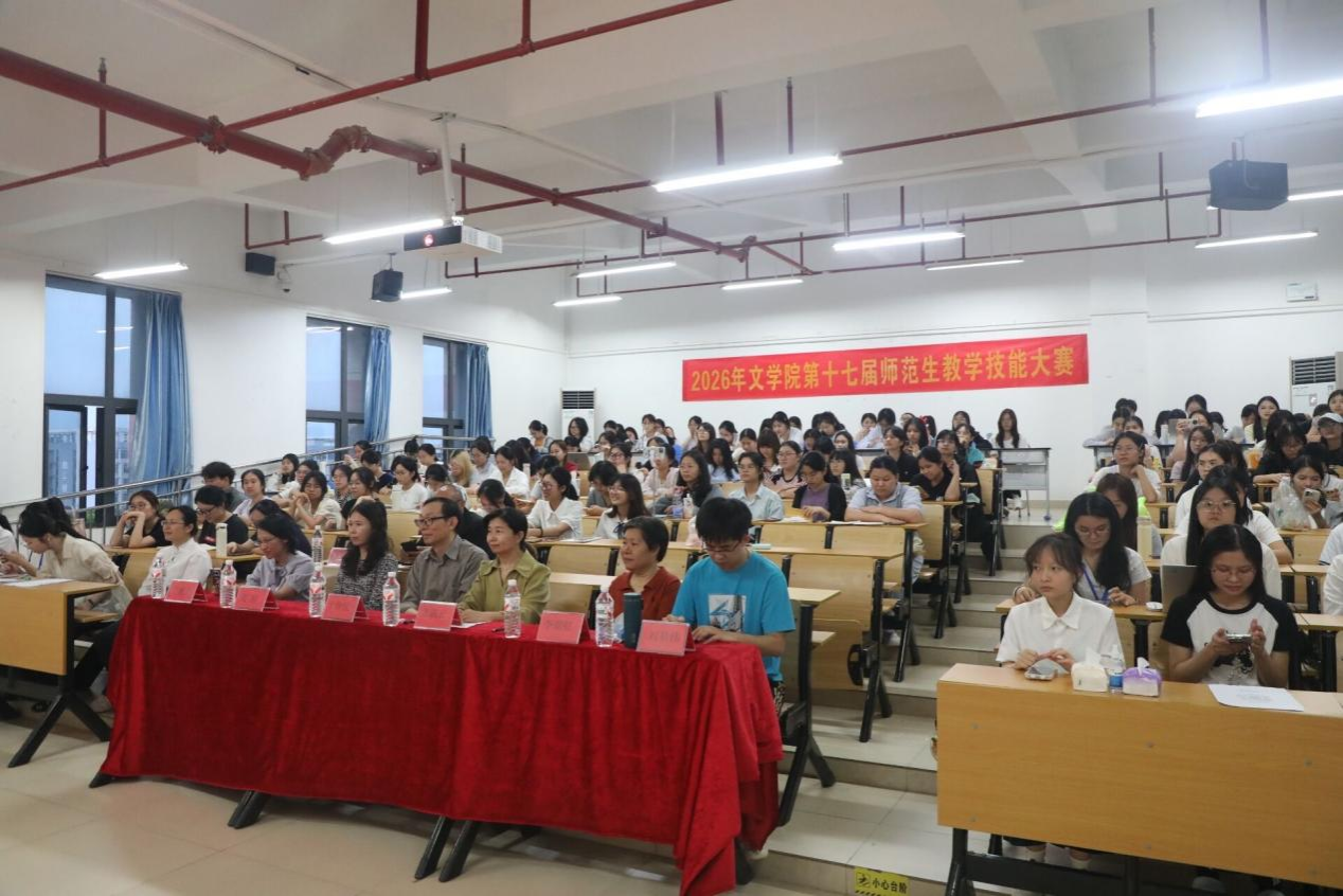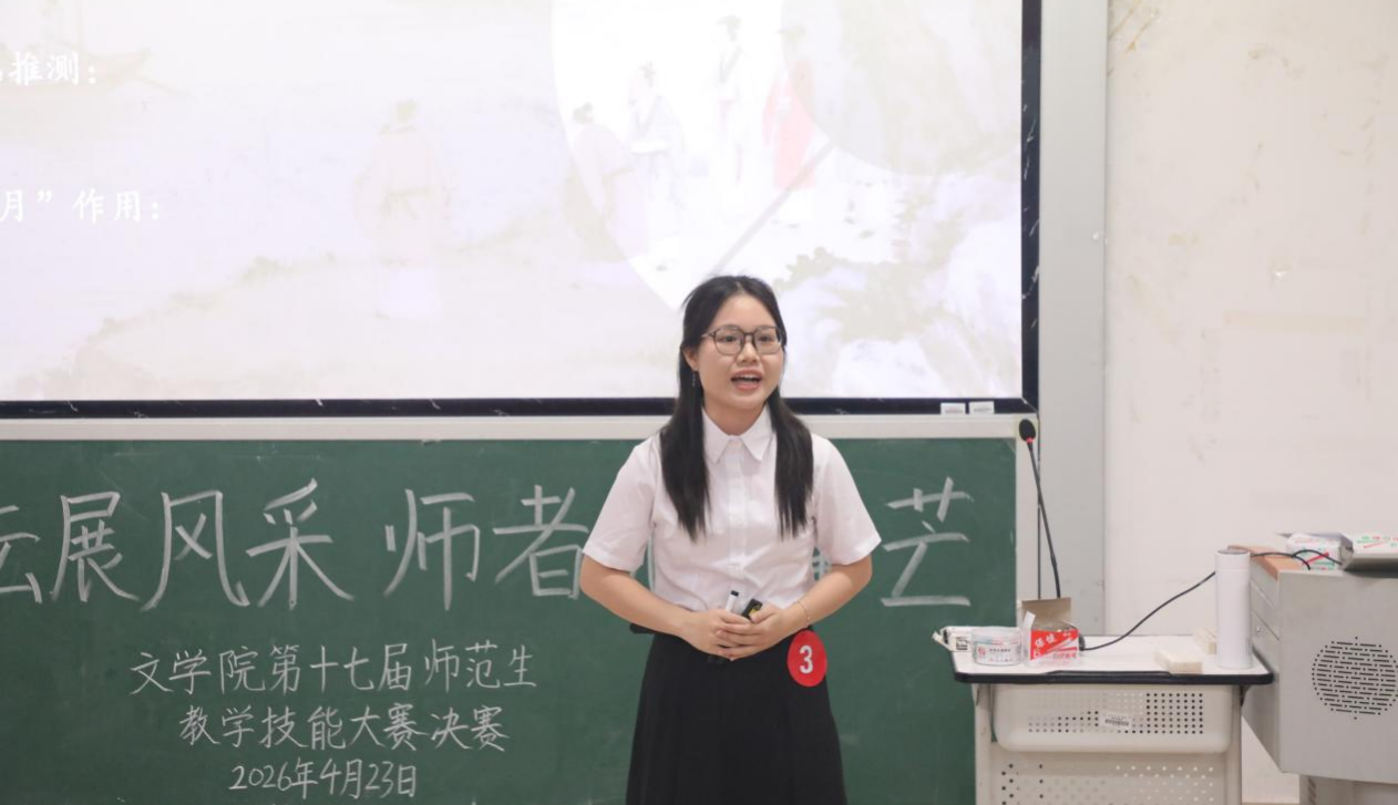 为深化师范专业人才培养,锤炼师范生教学基本功与综合执教能力,搭建教学技能交流展示平台,2026年4月23日晚上,文学院在五合校区文科综合楼415教室举办第十七届师范生教学技能大赛院级决赛。文学院副院长张淑云到场指导,于钟民、黄铮、许秋群、刘基伟和李朝红五位老师担任大赛评委。