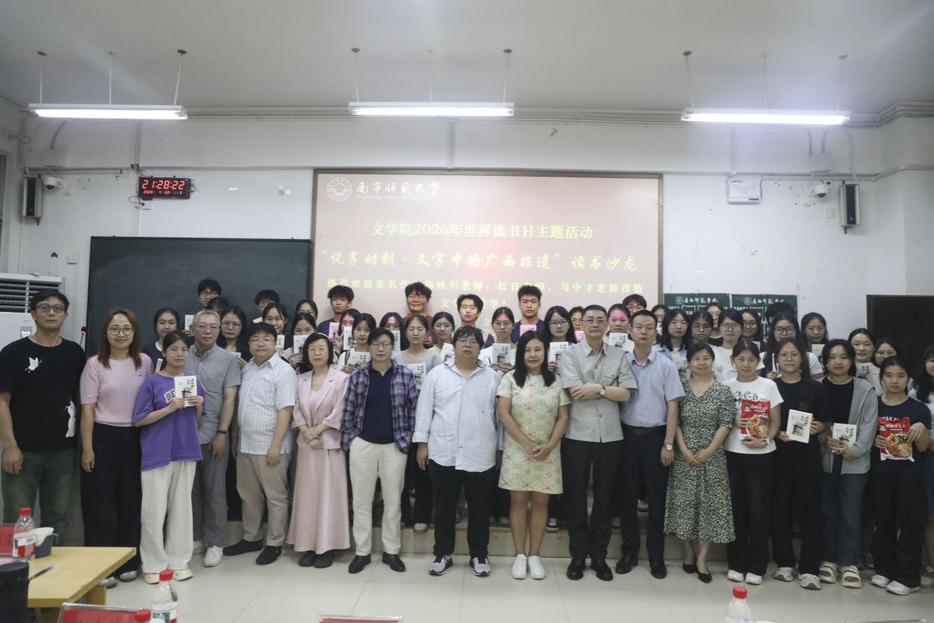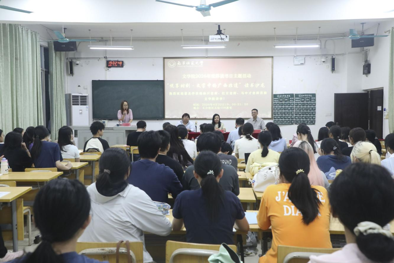 在“世界读书日”来临之际,为深入推进全民阅读、传承非物质文化遗产,2026年4月22日晚,文学院在五合校区五综108教室开展“悦享时刻·文字中的广西非遗”读书沙龙活动。活动特邀广西本土作家杨映川、潘红日、马中才莅临现场,与文学院师生共赴一场文学与“非遗”的对话。文学院副院长(主持行政工作)刘振平、副院长张淑云及师生代表100余人参加本次活动。活动由外国文学教研室韦玫竹老师主持。