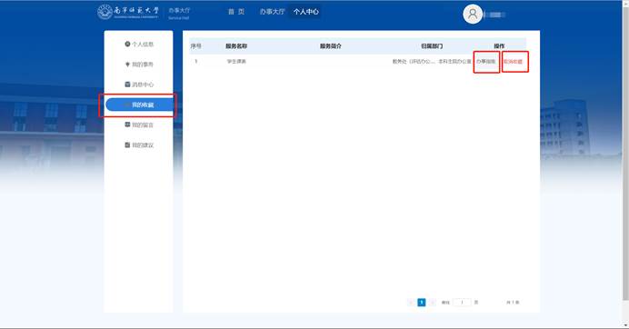 点击我的收藏按钮,在我的收藏界面可以快速进行服务办理,或取消收藏该服务