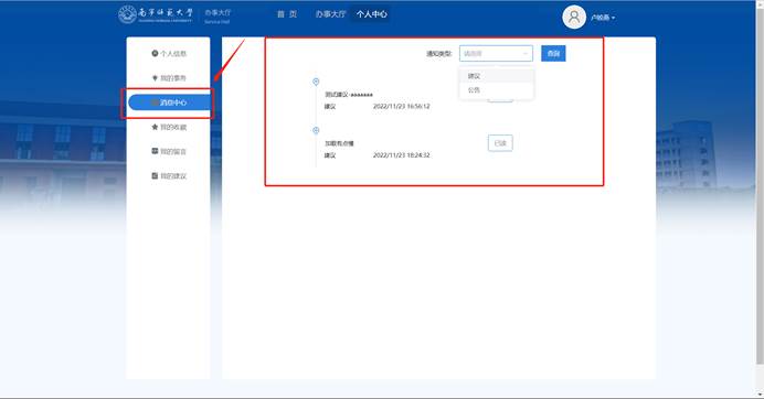点击消息中心按钮,在消息中心界面可根据通知类型查看用户接收到的消息